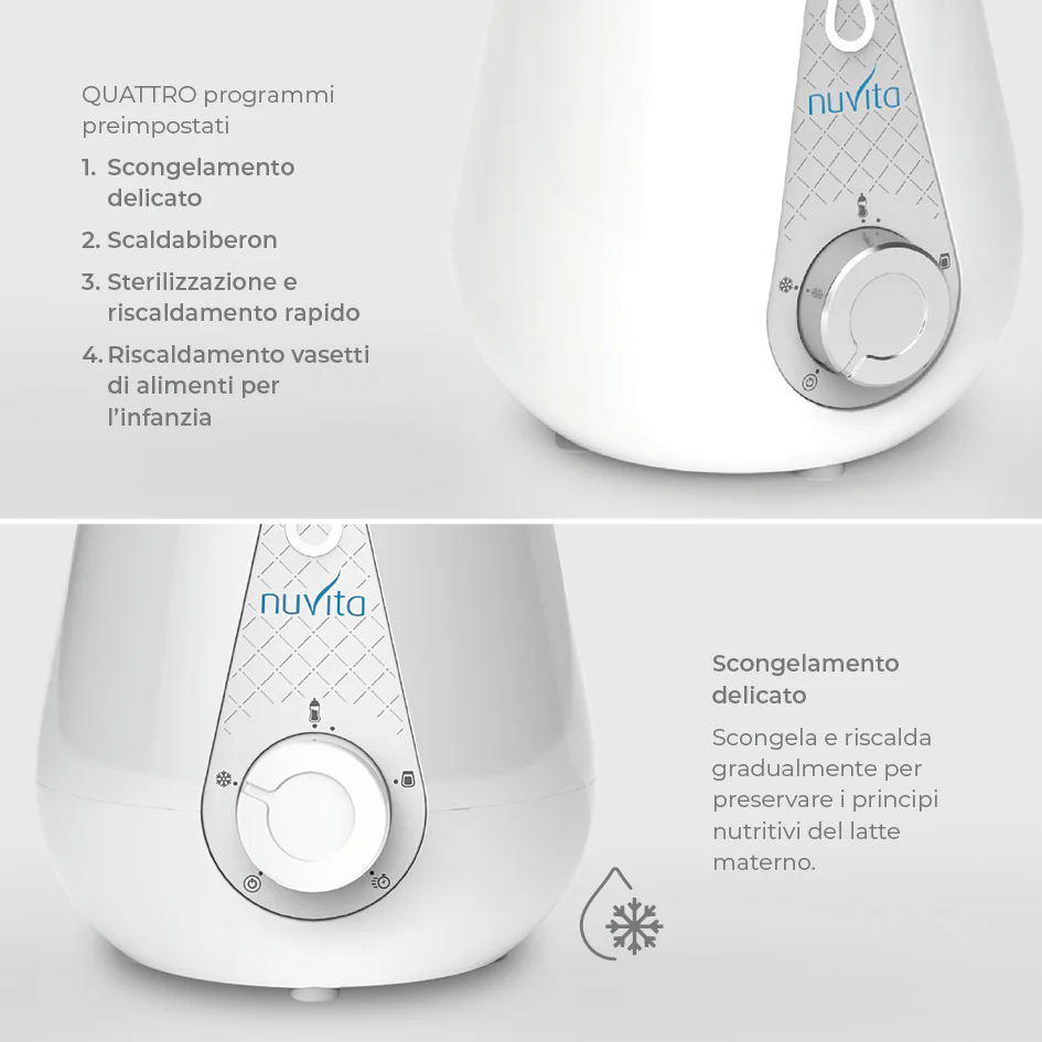 Con il programma riscaldamento veloce, ideale per il latte artificiale e le pappe, scalda rapidamente in soli 2 minuti e 50 secondi, mentre con i programmi con riscaldamento graduale è possibile riscaldare e scongelare il latte materno senza surriscaldarlo, preservandone i principi nutritivi.